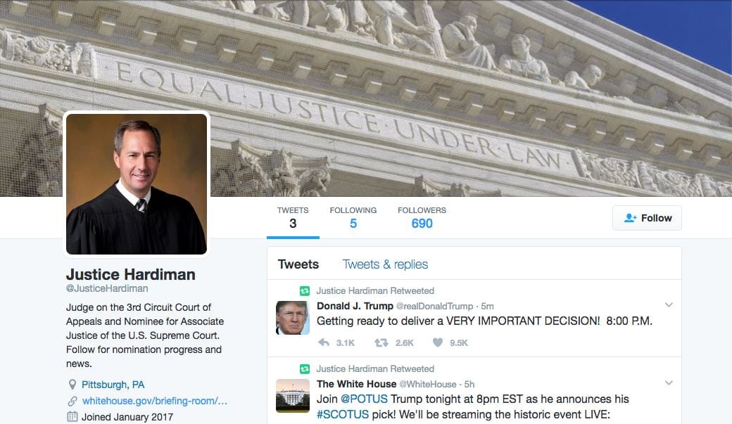 Hardiman's account was not as presumptuous, though, calling him a "Nominee for Associate Justice of the U.S. Supreme Court."