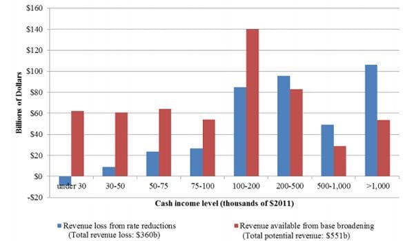 The graph shows that cutting individual income tax rates by 20 percent from today’s levels would reduce tax burdens by $251 billion per year (in 2015) among households with income. Governor Romney has explicitly promised to retain current preferences for dividends and capital gains ... if we assume a strict interpretation of the second goal  ... there are only $165 billion of available tax expenditures to close in that group if tax rates are cut).