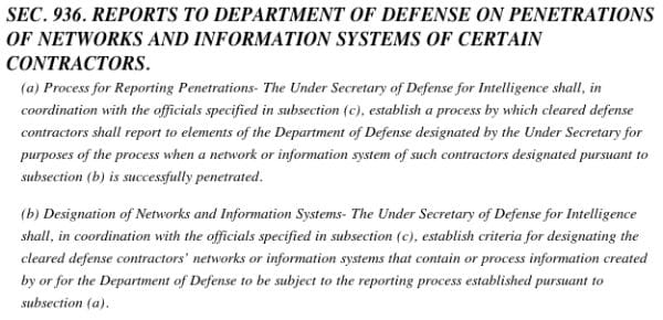 "The conference report requires the Secretary of Defense to create a process requiring defense contractors that use or possess classified or sensitive DOD information to report successful cyber penetrations of their networks or information systems. Additionally, if the Department is concerned about a particular event and feels the need to determine what DOD information may have been lost, the provision would authorize DOD to conduct its own forensic analysis, upon request, and subject to limitations. This represents a major breakthrough in the Nation’s cybersecurity. However, other sensitive areas where we are threatened with cyber attacks, such as the financial, police and transportation sectors, need similar action."