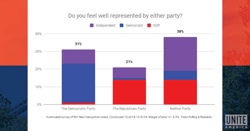 Unite America polled New Hampshire voters in December 2018 to get their views on the issues they care about, both major political parties, and the potential of a bipartisan “Unity Ticket” in 2020.