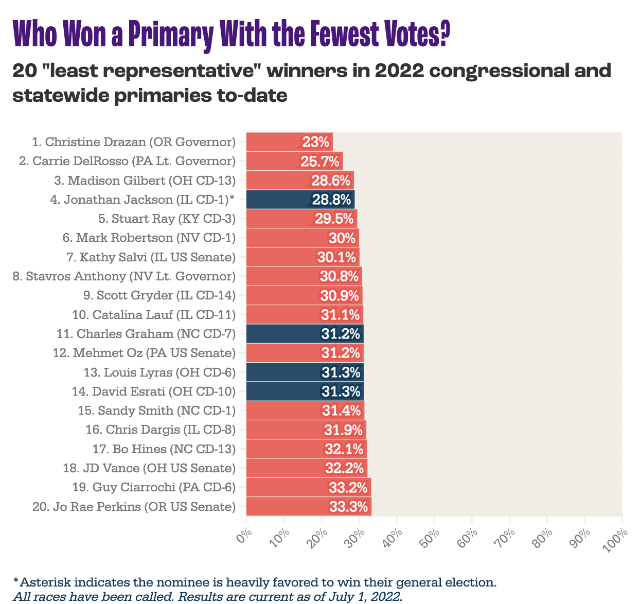 New analysis from the nonpartisan better elections group FairVote found that the winners of 55 statewide congressional and statewide primaries in 2022 so far garnered less than 50 percent of the vote. Nineteen of these elections were decided by less than a third of voters.