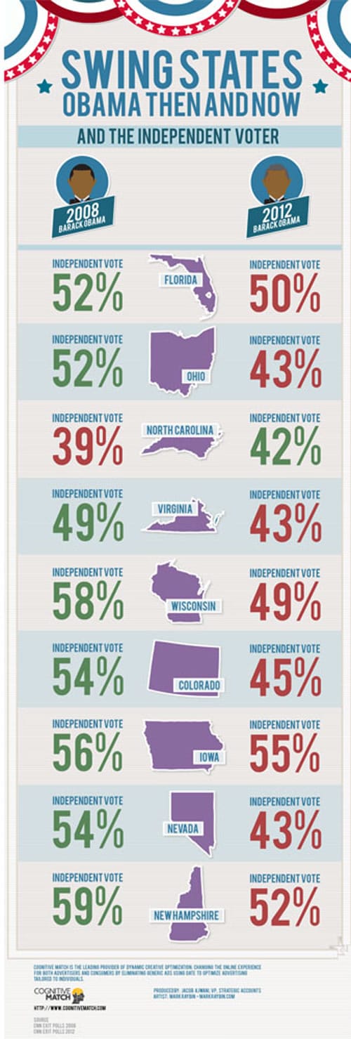 Cognitive Match released this infographic soon after the 2012 election. Obama lost independent voters in every state except North Carolina, compared to 2008. North Carolina was the only swing state that went to Romney.