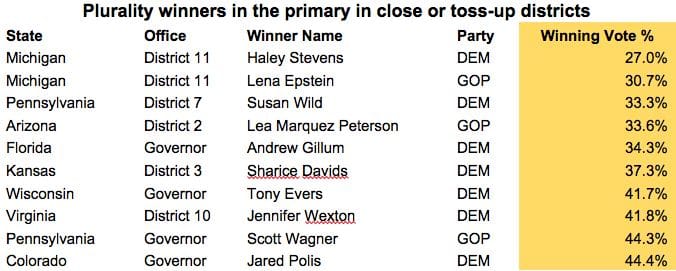 The chart below lists other close races to watch in November with a plurality primary winner on one or both sides.