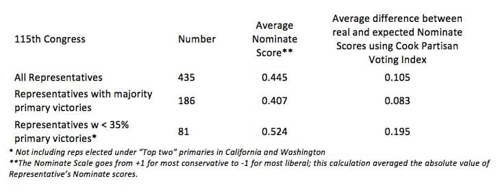 Research conducted by Election Reformers Network (ERN) indicates that candidates who win plurality victories in the primary and then go on to Congress tend to have more extreme voting records. Using a political science scale called NOMINATE score that measures roll call voting on a spectrum from very liberal (negative 1) to very conservative (positive 1), ERN found that the average NOMINATE score of House members who had entered Congress after winning a primary with a low plurality result was nearly a third higher than for House members who won with a majority (see chart below).