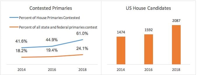 The good news is that competition and participation both increased significantly in 2018, as more people ran, more people voted, and more primaries actually offered choice to voters. The number of candidates seeking office jumped by 30% compared with 2016, and the percent of primaries that were contested also rose significantly, particular for House races (see charts below).