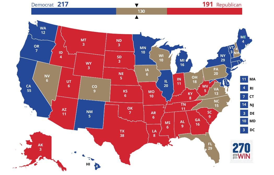 The Democrats have a slight lead in the secure electoral votes. Being able to consistently claim California is definitely a major boost.