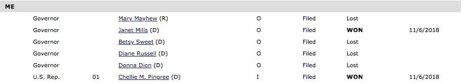 Yet each and every one of the 57 female California Republican and Democrat candidates were included. CAWP has all female candidates who ran or are still running for Maine governor -- as long as they have an "R" or "D" next to their name. Independent State Treasurer and candidate Terry Hayes has been left off the list.
