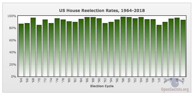 "Few things in life are more predictable than the chances of an incumbent member of the U.S. House of Representatives winning reelection. With wide name recognition, and usually an insurmountable advantage in campaign cash, House incumbents typically have little trouble holding onto their seats—as this chart shows."