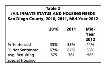 A report by the SANDAG’s Criminal Justice Research Division states that the “average number of realignment offenders detained locally has increased. In addition, the average number of inmates requiring specialized housing has gone up, reflecting the greater needs of the realignment population.”