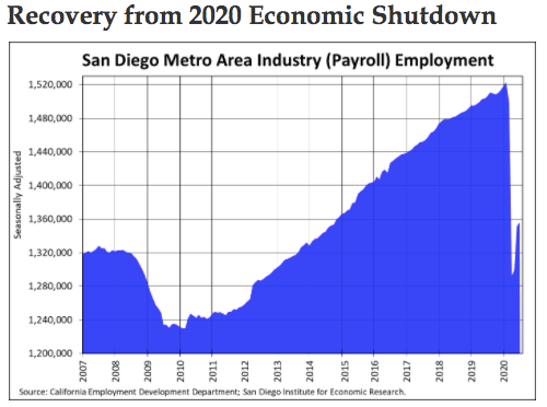 In San Diego, when the region would normally add jobs in March, April and May, the region lost 230,000 — 15.2 percent of the 1.5 million labor force working at the time. By June and July, 68,500 jobs were added back, under other circumstances, an extraordinary number of job gains for just two months.