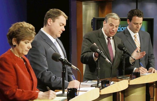 Candidates for San Diego mayor appear in an April KPBS debate. Credit: Los Angeles Times