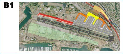 Why was Alternative B1 not preferred? It was blocked by one key factor: to build the terminals on the Pacific Highway of the side of the runway required a 150 foot strip of Marine Corps Recruit Depot land (27 acres) to extend Taxiway C. Taxiway C did not extend the full length of the runway, meaning airplanes landing from the east would have to turn left off the runway and then cross the runway to reach the gates, a process that reduced the maximum number of flights the airport could handle and raised safety concerns. Interestingly, the MCRD property had no buildings on it, but consisted of recreational and training exercise facilities. It would have required realigning a sports field and running track. While this might seem unrelated to the current Grand Central Station proposal, it is included here because indicative of the kind of obstacles that have to be identified early if the project is to become a reality. We never anticipated that something as simple as a 150-foot-wide strip of government owned land would be enough to stop a regionally beneficial solution.