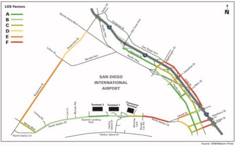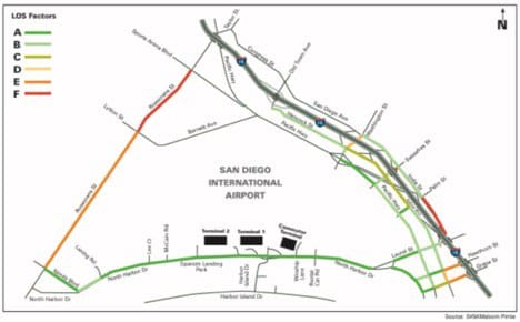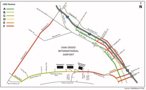 In addition to carrying a large percentage of airport traffic, these city streets are congested to unsatisfactory levels of service (LOS). The state of California’s transportation agency, Caltrans, defines these levels of service: