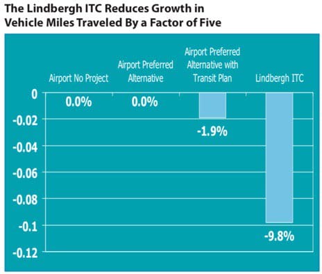 Vehicle Miles Traveled (VMT). Reduction in the growth in vehicle miles traveled directly reduces greenhouse gases and emissions of criteria pollutants. The Lindbergh ITC would reduce growth of VMT by a factor of five over (2005) conditions, a reduction of 9.8%. The airport’s preferred alternative reduced growth in VMT by 1.9%. According to the report, “these reductions (and therefore, related emissions) would decrease most significantly in the residential neighborhoods and surface streets near the airport.” It should be noted, however, that these decreases in the growth of VMT come in the face of overall growth in traffic for all scenarios, including the ITC, because of projected additional demand for air travel.