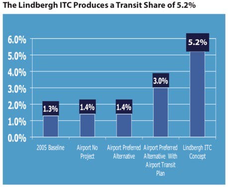 Transit Share. By linking the transit options in one location adjacent to the airport, transit use increased by 5.2 percent. The airport preferred alternative increased transit share by 1.4%, the same as the no project alternative. Even with an airport transit plan in place, the preferred alternative only increases transit share by 3%.