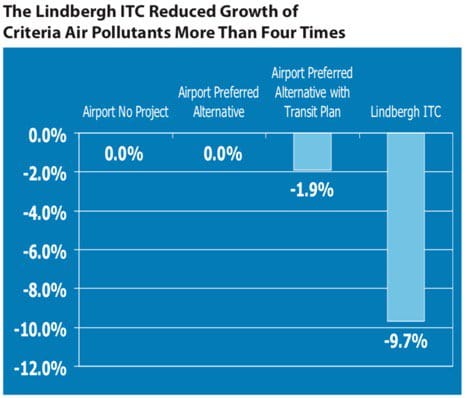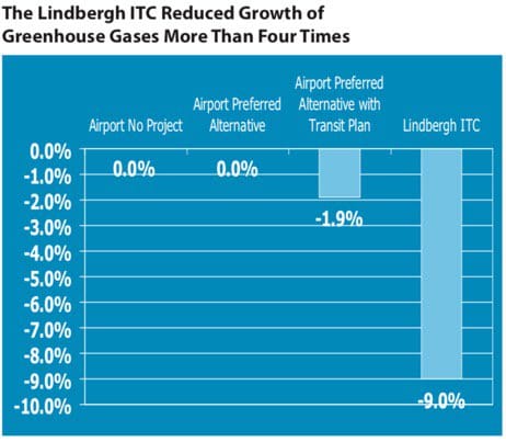 Greenhouse Gas Emissions. An important driver for creating the Lindbergh ITC was the reduction in the growth of greenhouse gases. In parallel with the reduction in vehicle miles traveled and increase in transit share, the regional reductions in GHG under our plan was 9 percent. The airport preferred alternative created no measurable reductions.
