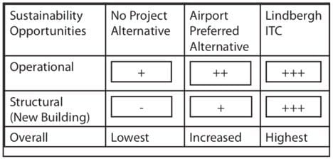 Sustainability and Green Airport and Green Building Opportunities. Finally, the airport addressed opportunities to create a greener, more sustainable airport. Our plan far surpassed the airport’s preferred alternative as can be seen in the chart below.