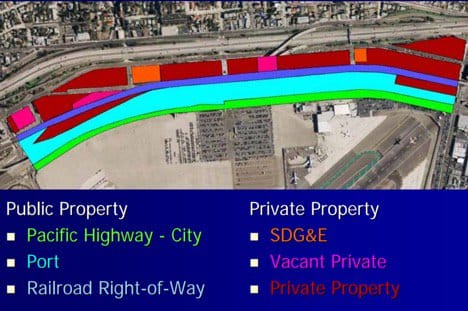 - Last, but not least, the project must be depicted on a current airport layout plan approved by FAA. This would largely remove any property from consideration for FAA funding, other than the land between Pacific Highway and the runway, where the current rental car facility is located, unless new land was obtained by the airport and included in an updated airport master plan. This would apply to both the SPAWAR and the ITC sites. Think again about the possibility of delay – especially when the need to obtain the land through purchase or eminent domain is required.