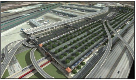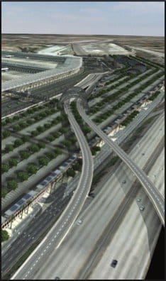 Between the airport terminals on the right and the ITC on the left, a 2,000-space parking lot provides convenient access for “kiss and fly” travelers at the passenger pickup level. Rail passengers would be picked up and dropped off on the left side of the loop. A skybridge takes passengers across the short-term parking area to link air with rail, rental car, taxi, shuttle, and other ground transportation found inside the structure. A loop system brings vehicles around both the train/trolley and airport.