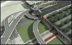 A loop system brings vehicles around both the train/trolley and airport portions of the ITC, with a ramp heading to I-5 South on the far left