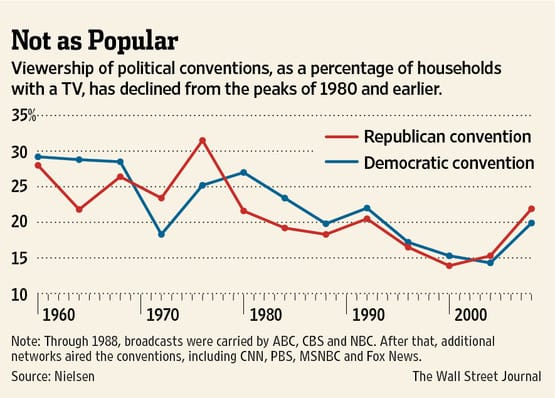 The Wall Street Journal concurs, arguing that "political conventions, long the ultimate made-for-TV presentation, this year are coming of age as digital-media events—highlighting the decline of network television coverage of the gatherings."