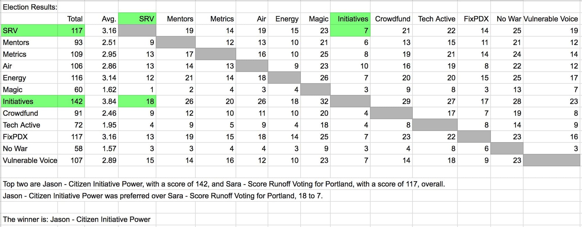 The results give real insights, and scoring and preferences are well-correlated. SRV showed both a level of overall support for each candidate, as well as the preference pairings between all the candidates. As Sara noted below, SRV tied for second place in the scorings, but actually beat Novick's FixPDX plan by one vote (14-13) in the preferences. Jason, the winner, beat the second and third place scorers by 18-7 and 17-7 in the preference totals respectively.