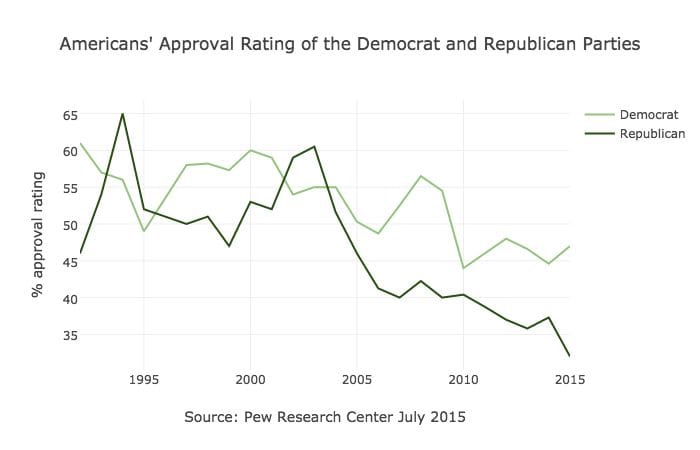 Considered together, declining voter turnout is most likely attributable to general voter apathy in election processes that are conducted for the partisan benefit of the Democrats and Republicans. At the same time voters are increasingly disillusioned, on a national scale, with the ability of those two parties to adequately represent them.