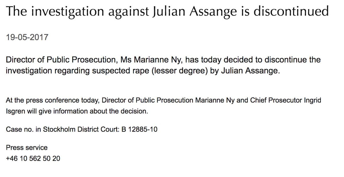 Reports released Friday morning that Swedish prosecutors have discontinued an investigation into rape allegations against WikiLeaks founder Julian Assange.