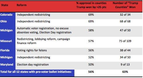 The success of such initiatives as redistricting reform, felon voting, and automatic voter registration has been well documented; what’s less known is how broad-based these victories were. The table below shows how reforms fared in “Trump Country,” counties the president won in 2016 by 25 points or more: