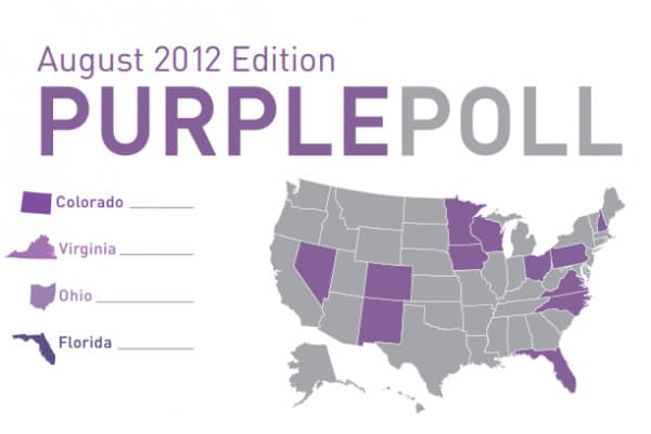 This month's PurplePoll surveyed the four states. The study shows that Gov. Mitt Romney has gained ground in Ohio and Virginia, states that have been going back-and-forth between candidates. The Republican ticket has a 2% advantage in Ohio and a 3% advantage in Virginia. Both numbers are improvements from July's poll numbers. However, Florida and Colorado have slightly swung in President Obama's favor since the Ryan announcement. The Democratic ticket is leading by 3% in Colorado, and trailing by 1% in Florida compared to 3% last month.