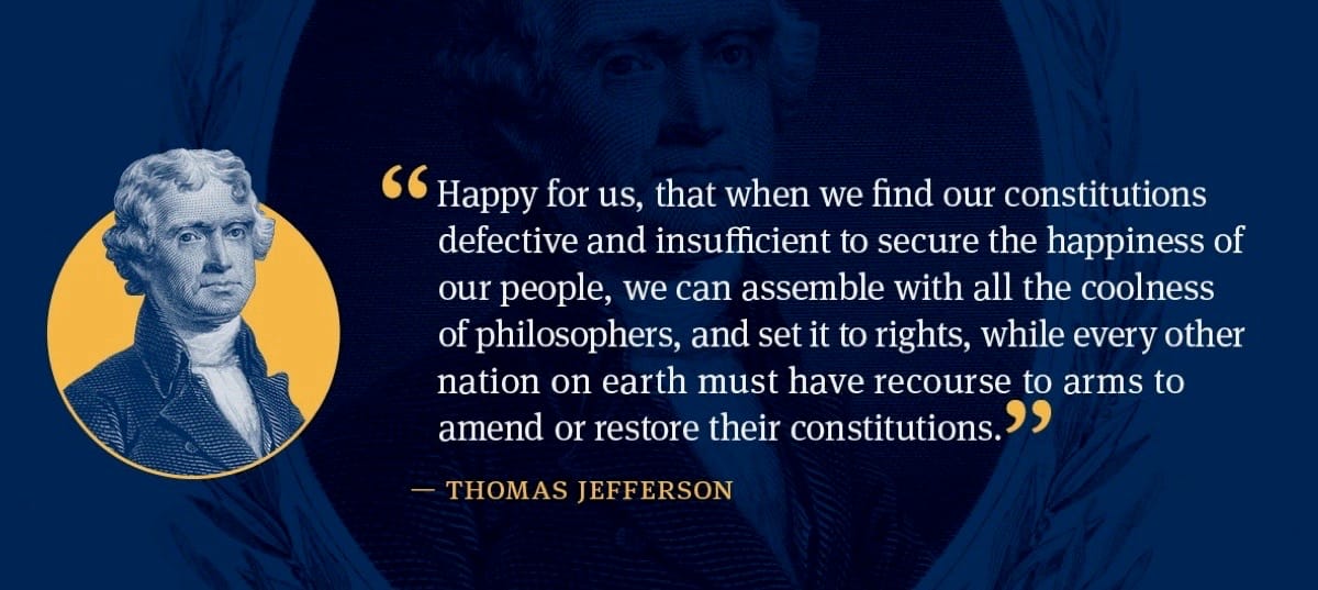 And this is why I like to call the reform movement going on right now: “The American Revolution, Part II.” Jefferson described the fruits of the first one, wherein hundreds of thousands of patriots took up arms and risked their lives in order to author the historic charter known as the US Constitution.