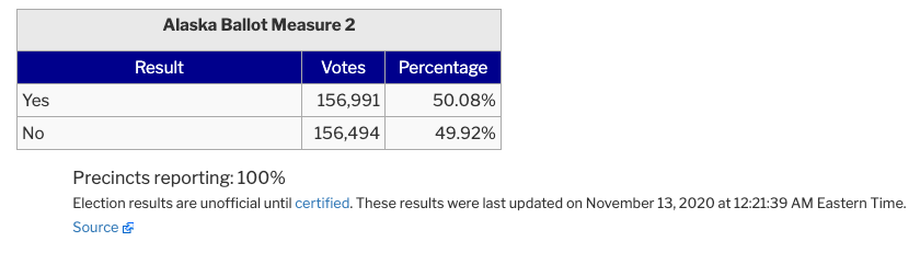 Update 11/13/2020: After counting more absentee ballots the better elections Amendment in Alaska, Measure 2, now has a slight lead in the polls. More ballots remain to be counted. Stay tuned for more information.