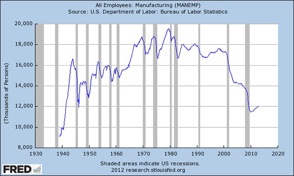 However, this isn't about what's good for one group of people versus another. The well being of America as a whole is the real question. Take a look at the chart below. Manufacturing employment is back to where it was in 1941 when America's population was vastly smaller. As a percentage of the workforce, the decline is much greater. Note the stunning fall in manufacturing employment starting in 2000.