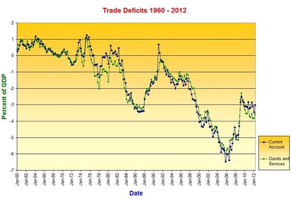 Indeed, gigantic trade deficits typically end in ruin. Ask the Greeks or the Spanish (or the Irish, a more complex case). The lure of cheap imports is fools gold at best. Argentina maintained a dollar peg to up to early 2002. It worked well in some respects. Inflation collapsed and imports were cheap. However, the trade deficit rose, debt proliferated, and in the end Argentina defaulted. The crash in Argentina was a deep as in the Great Depression in the United States. Fortunately, Argentina changed course (devalued) and world commodity markets rose (China). As a consequence, Argentina's depression was not nearly as long as the U.S. in the 1930s.