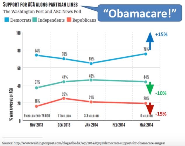 - In 2014--4 years after the ACA was passed into law--Republicans and Democrats were--not surprisingly--as split as ever on it. But when pollsters asked about "Obamacare" rather than the ACA, 15% more Democrats supported it and 15% fewer Republicans supported it.