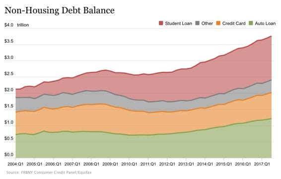 As you can see, Household debt has hovered between 8 and 10 trillion dollars since the end of the recession, and non household debt has seen a rapid increase over the past few years, growing by about $1 trillion since 2013. So, what has lead to the increase in non-household debt? The following graph will give us some insight: