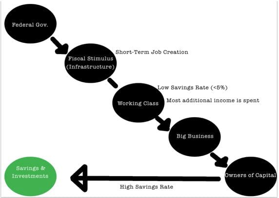 And as we know, every business has at least one owner. These owners, shown as “Owners of Capital” in the graphic, tend to be towards the top of the income spectrum, and have much higher savings rates than the average American. Since they have a higher savings rate, they are the ones who will benefit from government stimulus packages over the long term, as they are in a position to invest and save much of what they earn.