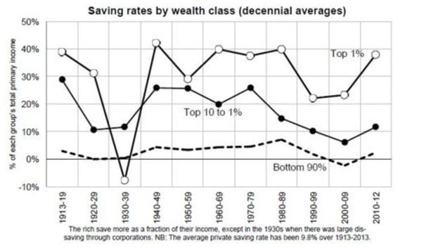 As shown in the graph above, while the top 1% has a savings rate close to 40%, the bottom 90% has a savings rate of under 5%.