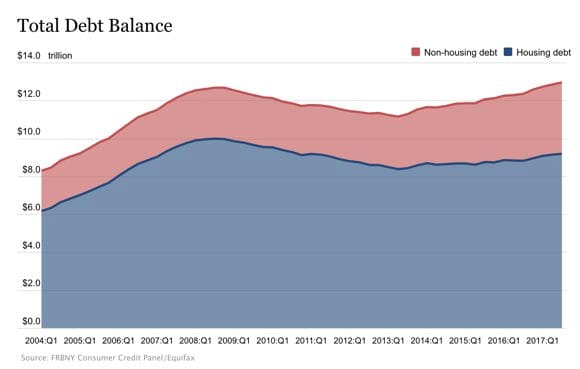 Following this line of thinking, it appears that the “owners of capital,” or business owners, will end up with the lions share of the money earned via these projects. This point is further bolstered when we look at data provided by the Federal Reserve concerning US Household Debt.