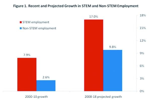 “STEM occupations will grow far more quickly than the economy as a whole (17% versus 10%), and will be the second-fastest growing occupational cluster, after Healthcare occupations.”