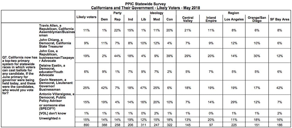 Ambos líderes, John Cox y Gavin Newsom, vieron enormes caídas en el apoyo de NPP de Abril a Mayo por 5 y 7 puntos, respectivamente.