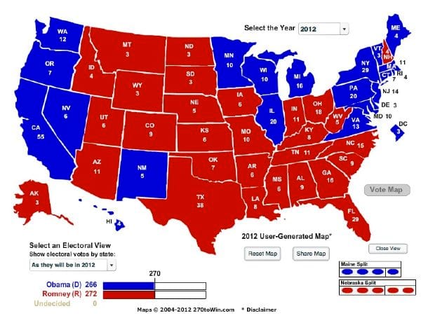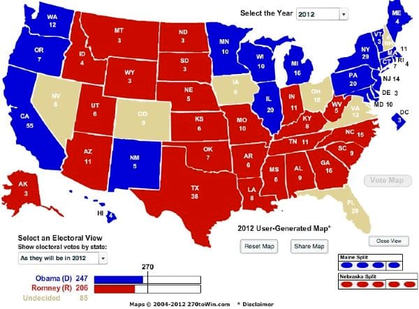 Ohio, Virginia, Florida, and Colorado will likely be the most interesting races to watch. Nevada looks like it is leaning more towards Obama at the moment and Romney has a slight lead in Florida. If the electoral map is colored in to give Obama Nevada then Romney would have to win all of the remaining battleground states to win the election without Virginia.