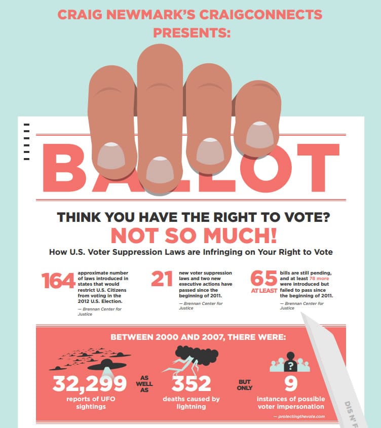 This election, an estimated five million eligible voters will be disenfranchised from the political process due to new voter identification laws. These de-facto voter suppression laws not only make it harder to register to vote, but also place restrictions on voting, creating an obstacle to eligible voters who lack government issued identification.