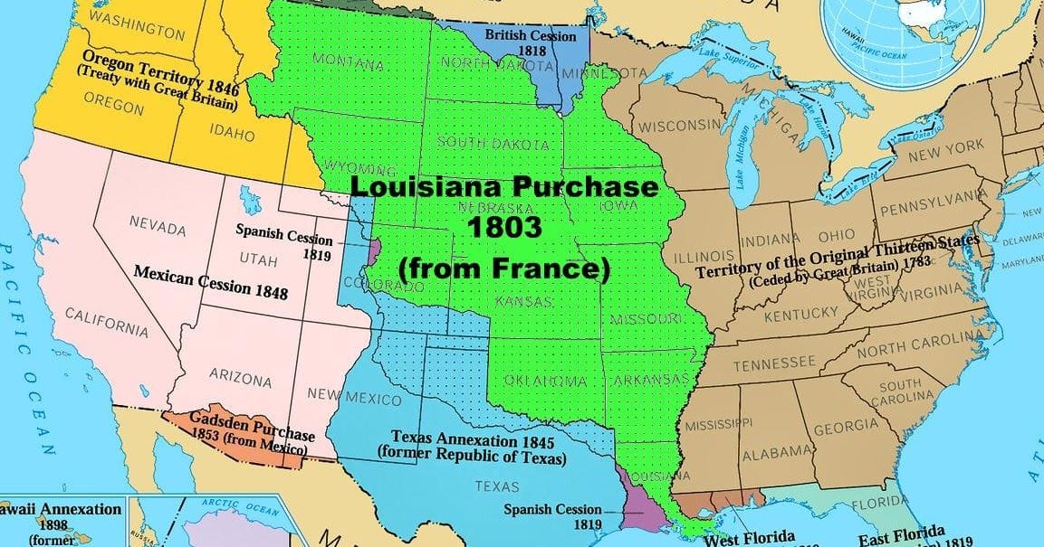 The Louisiana Purchase brought New Orleans into the United States and doubled the size of the country, adding the land from the Mississippi River to the Rocky Mountains and from the Canadian border to the Gulf of Mexico, land that would eventually become the states of Missouri, Kansas, Nebraska, and all or parts of 12 other states.