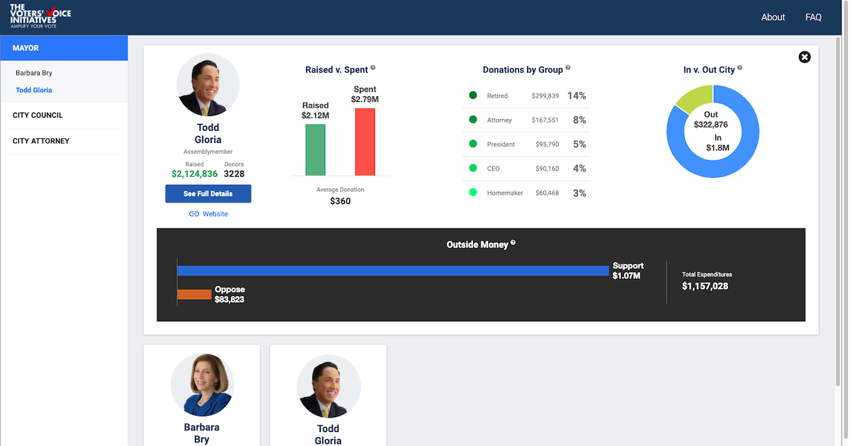 The San Diego Voters’ Voice Transparency Dashboard is one of only a handful of platforms to provide voters easy access to campaign finance information. At this time, Oakland, CA, Seattle, San Francisco and New York City have similar platforms.