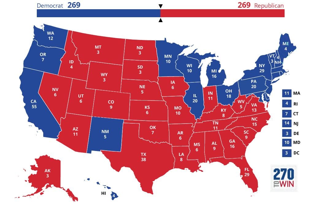In the event of a projected tie in the Electoral College, one Elector could change everything by switching their vote. In this scenario, the vote would then become 270-268, giving the advantage to one campaign over the other. The lack of restrictions on Electors in some states means that not every state is guaranteed "winner take all." Most experts say this is highly improbable, but there have been instances in the past when an Elector has changed their vote.