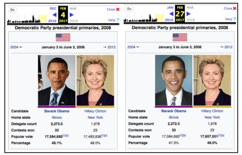 Until a few days ago, the Wikipedia page, "Democratic Party presidential primaries, 2008" listed Barack Obama as the winner of the popular vote in the 2008 Democratic primary. However, Obama lost the popular vote in the primary, but won the nomination by garnering more delegates. Images below show snapshots from the Internet Archive, the Wayback Machine.