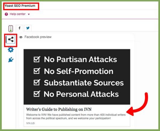 Additionally, manually putting in the headline into the Yoast SEO Facebook settings is important for social media shares so only the headline appears, without “- IVN.us.”